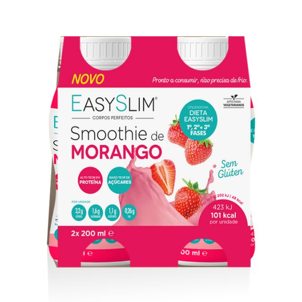 Delicioso Smoothie com sabor a Morango, ideal para o pequeno-almoço, ceia ou lanche da manhã ou da tarde. Permitido a partir da 1ª fase da Dieta EasySlim®, esta bebida está sempre pronta a consumir e não precisa de frio.